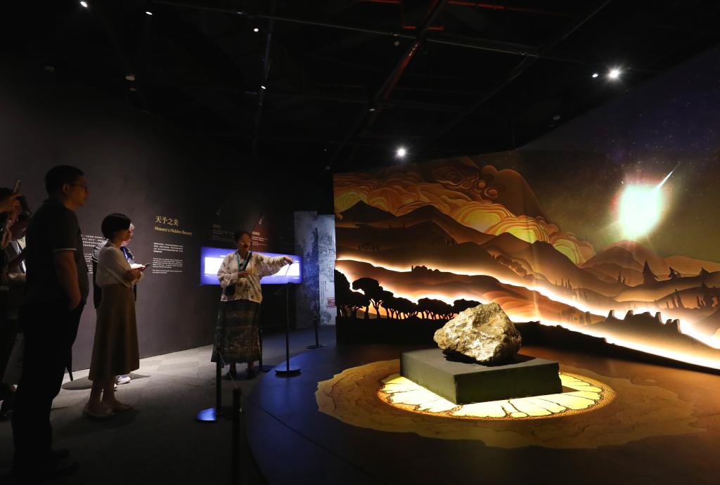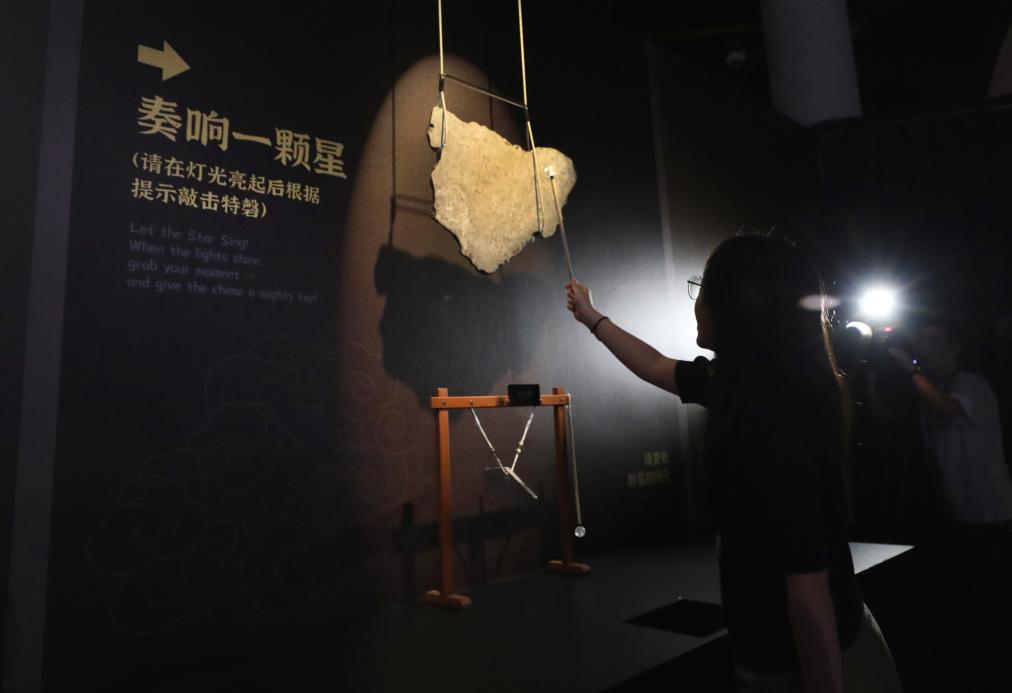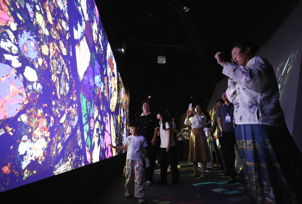 7月18日,一名参观者在体验敲击陨石切片发声的互动游戏。