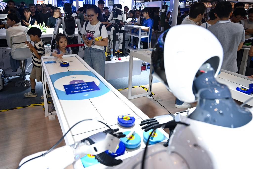 7月29日,小朋友在和一款机器人玩冰壶游戏。
