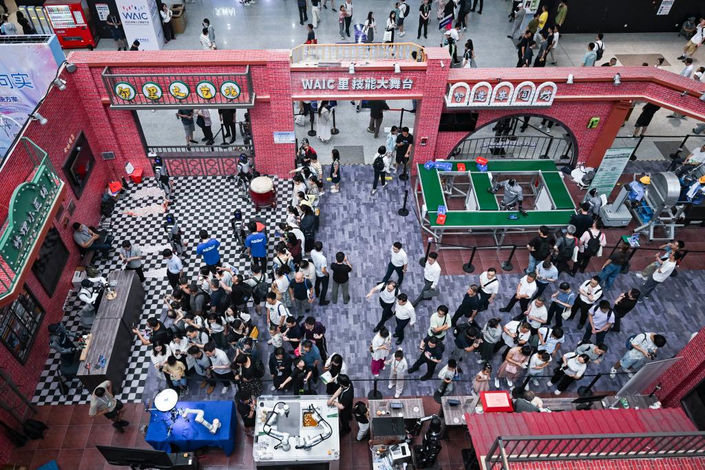这是7月29日拍摄的“WAIC里技能大舞台”,多款机器人在此进行技能展示。