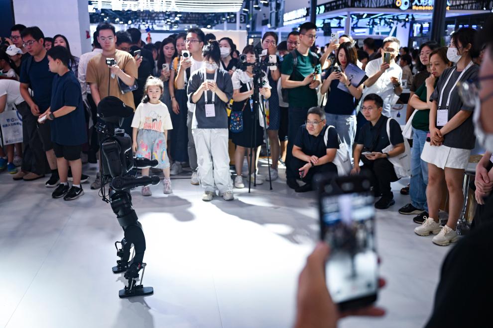 7月29日,参观者在观赏一款可用于零售、工业等多种场景的机器人。
