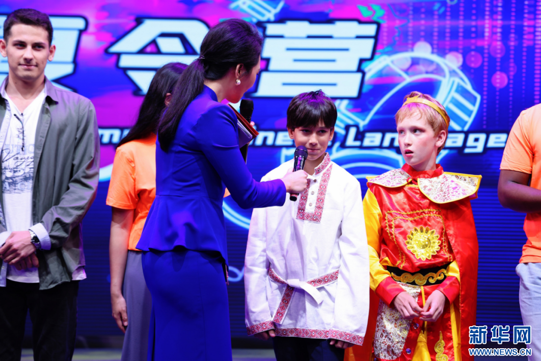 8月28日,来自美国、比利时、俄罗斯、墨西哥等国的15名青少年来到邯郸,参加由中外语言交流合作中心主办的2025“汉语桥”中文+影视配音主题夏令营活动。图为开营仪式上美国选手言俐睿在讲成语。马令怡摄