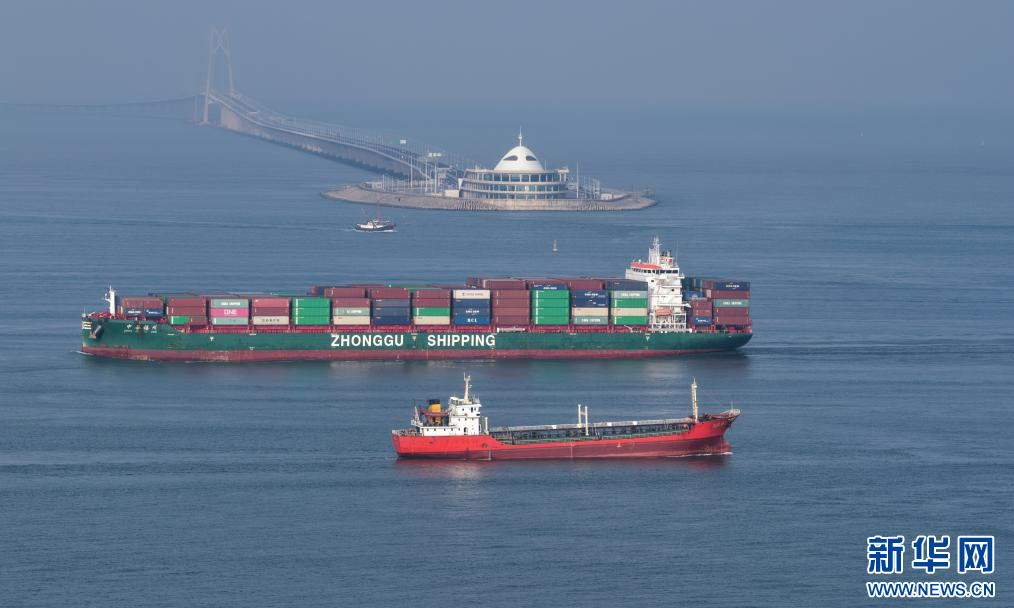 在伶仃洋主航道上的船舶驶过港珠澳大桥西人工岛(10月19日摄,无人机照片)。新华社记者 邓华 摄
