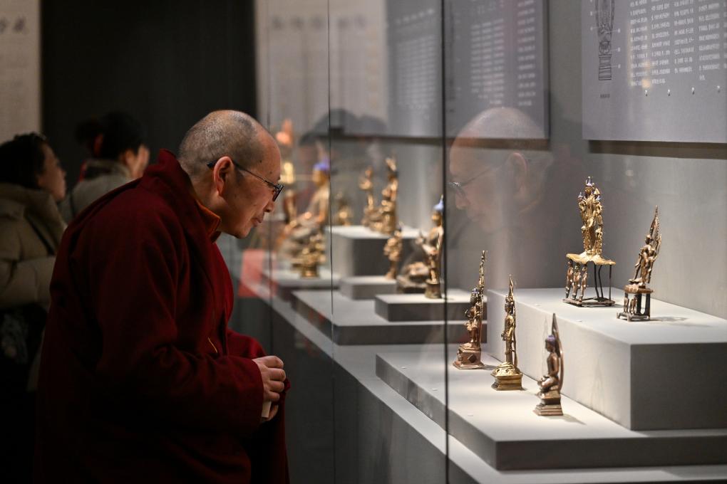 2月9日,参观者在展览上观看尼泊尔菩萨造像。