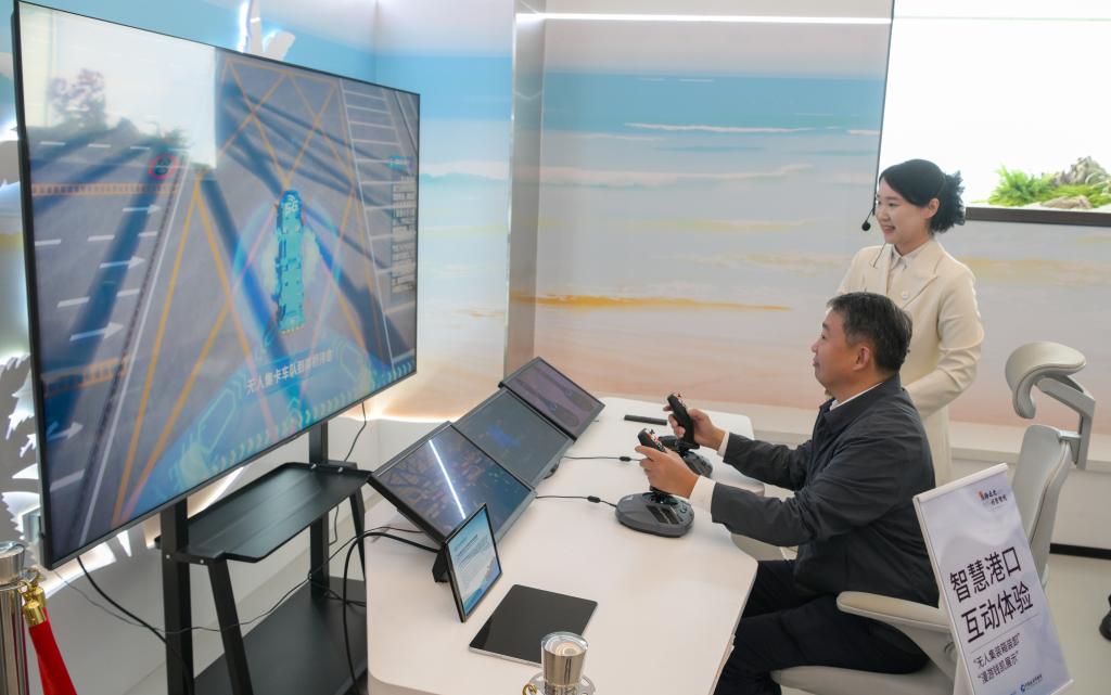 3月19日,观众在“一带一路”主题数字展上进行智慧港口互动体验。