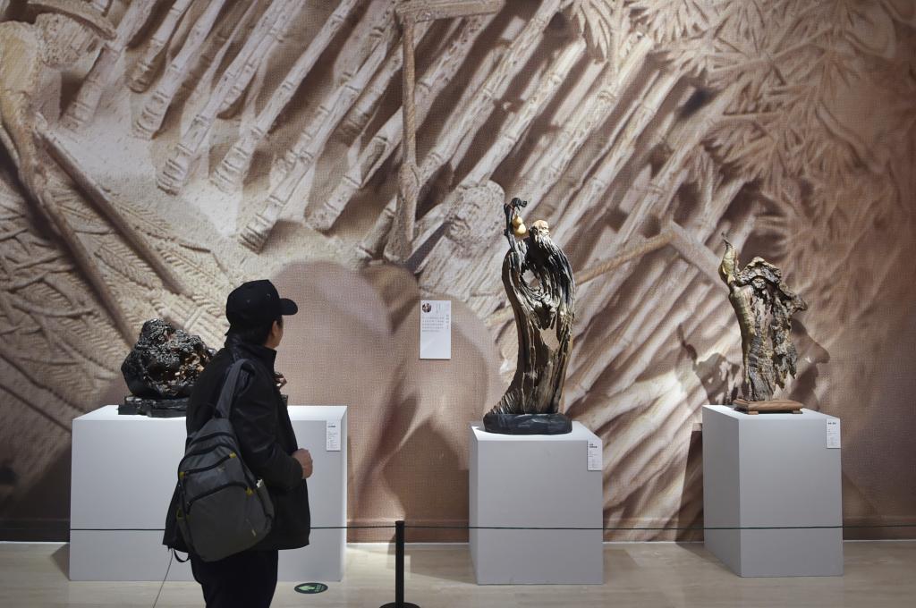 3月23日,参观者在中国美术馆观看展出的木雕展品。
