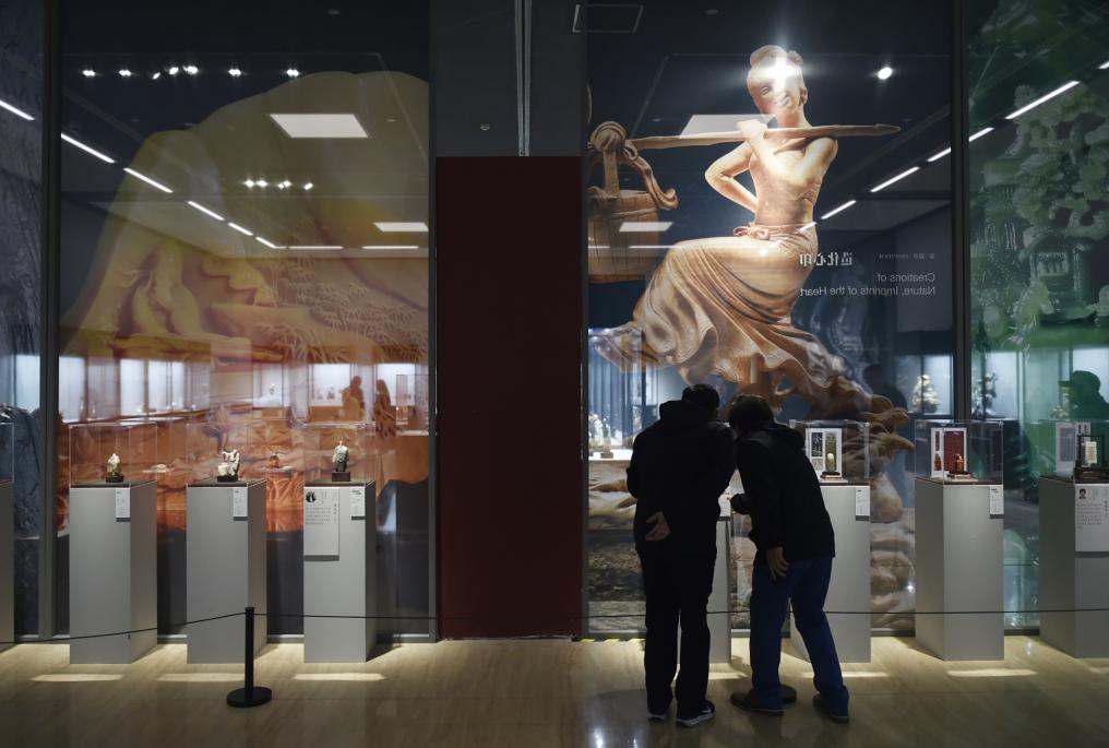 3月23日,参观者在中国美术馆参观展出的玉雕展品。