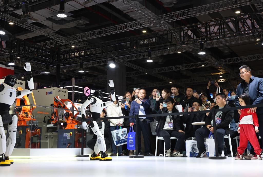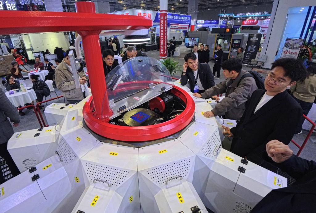 3月23日,参观者近距离观看一款转台式多工位柔性复合机床展品。