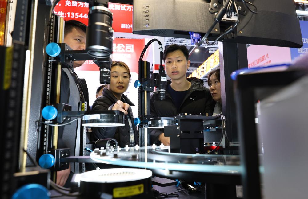 3月23日,参观者在一台光学影像自动化检测设备前驻足观看。