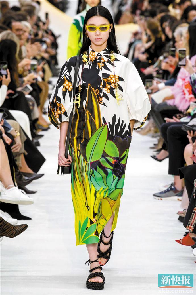担心色彩过于鲜艳难驾驭,可以试一下单色化处理的热带植物印花,虽然穿搭难度降低但浓郁复杂的图案依然冲击力十足,造型同样能出彩。