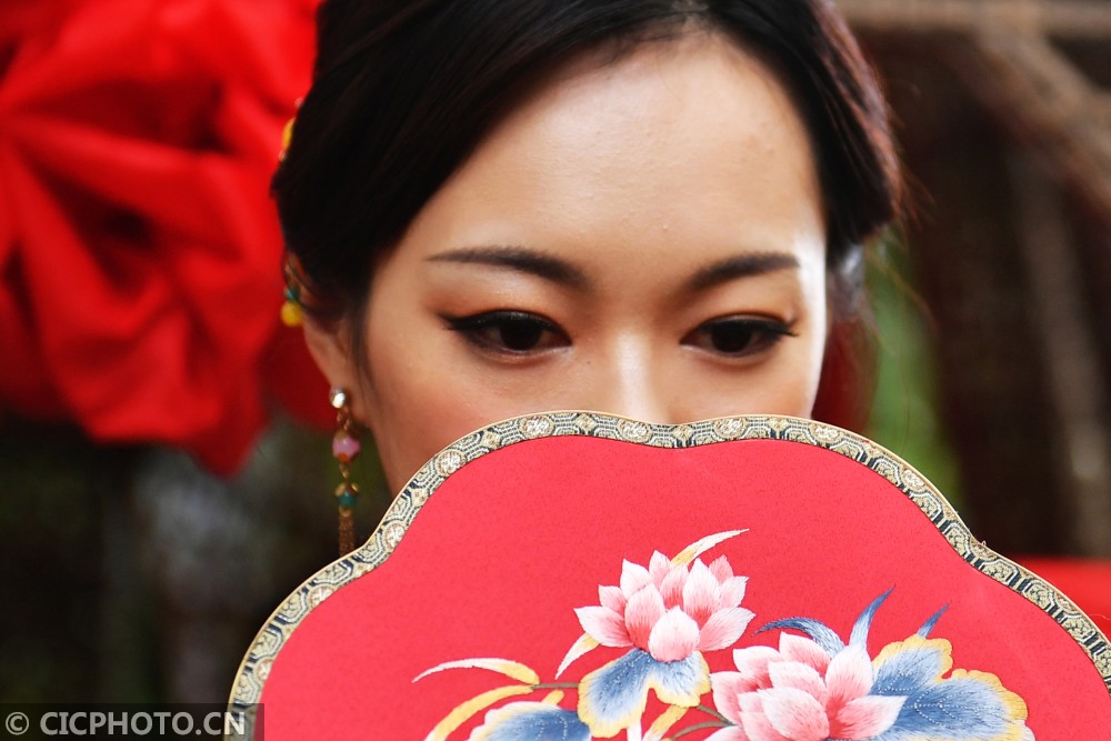 ↑2021年6月2日,在山东省青岛市八大关中式婚礼庭院秀现场,“新娘”在妆奁之礼上以扇掩面。CICPHOTO/王海滨 摄
