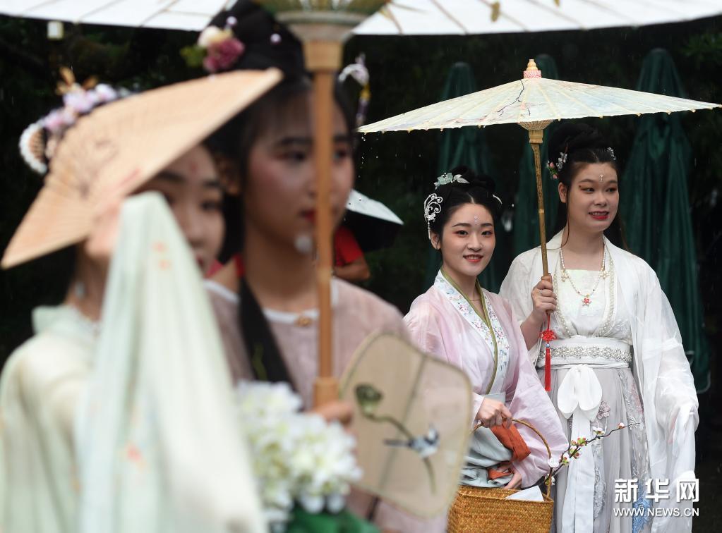6月20日,汉服爱好者在游园中。