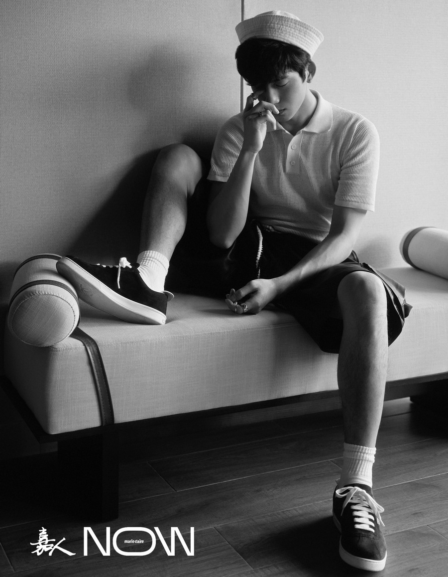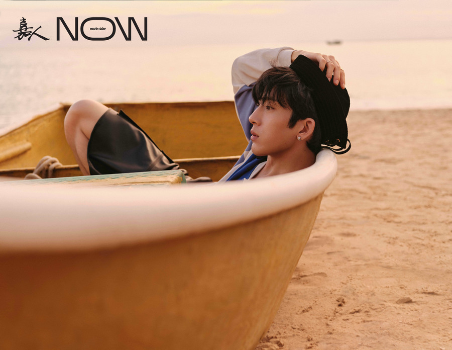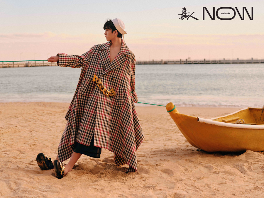 海滩边的井柏然完全释放天性,时而身穿粉蓝印花上衣搭配黑色七分裤及同色系海军帽,光脚在沙滩上雀跃奔跑;时而慵懒躺在木舟中,出神望着远方。身后海面光影簇簇,与衣服相映衬的粉蓝夕阳与海天相接,十分唯美。不规则剪裁千鸟格大衣与白色水手帽的“相遇”为这组大片增添了几分少年魅力。