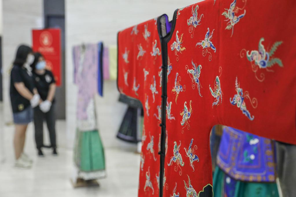 7月13日,著名古典美衣收藏家毕红在为嘉宾介绍其收藏的清代宫廷服装。