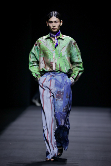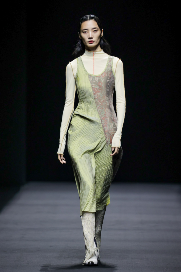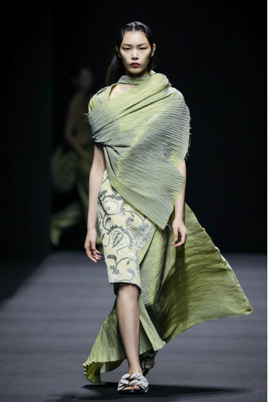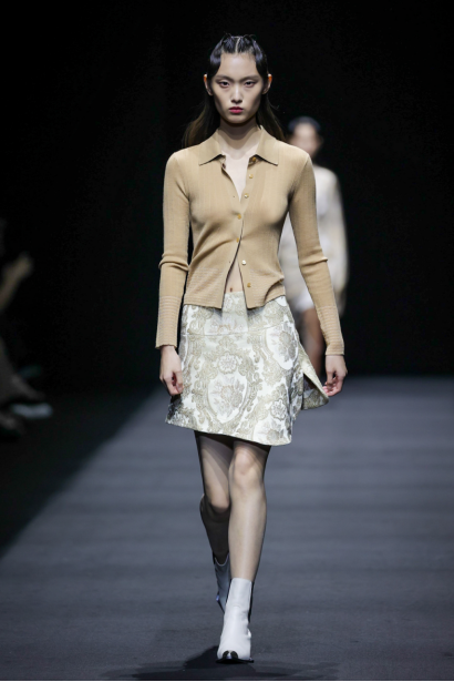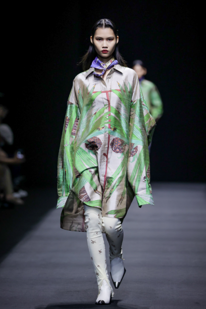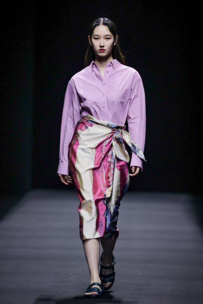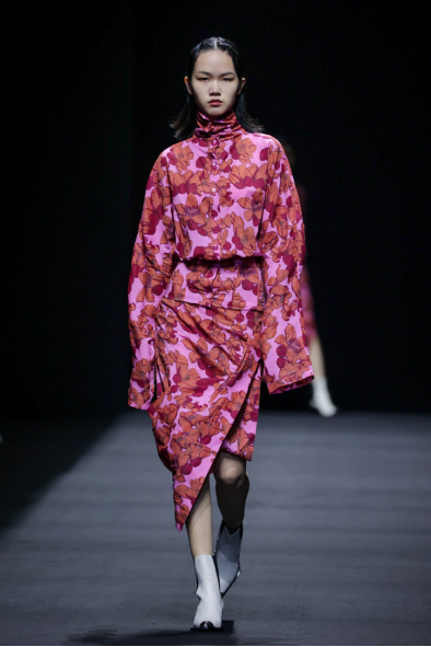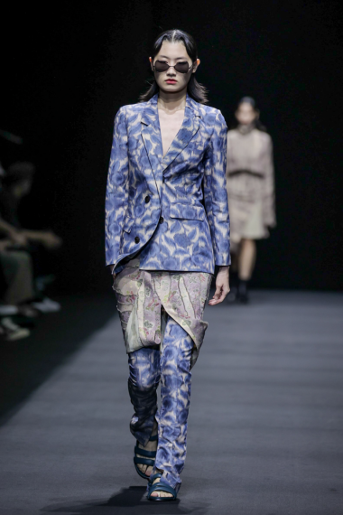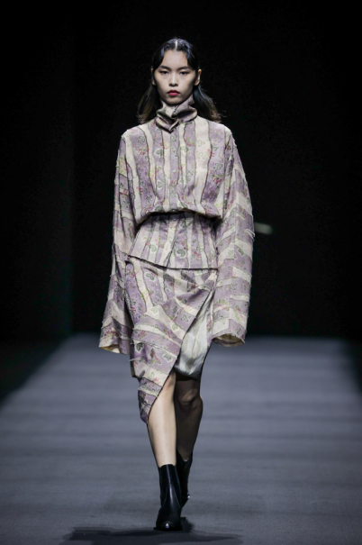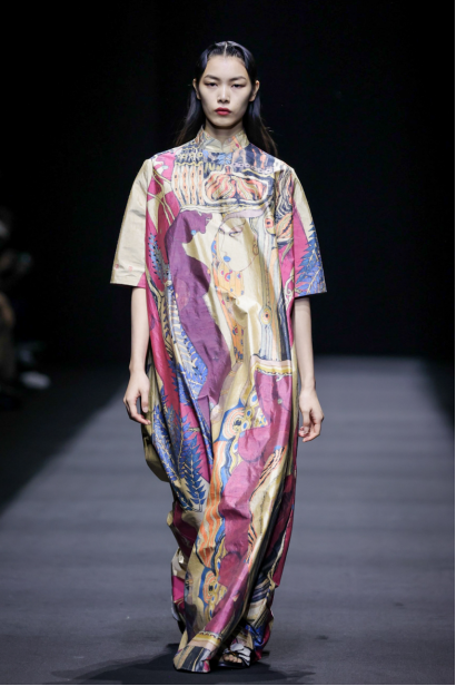 在这一系列中,设计师尽情利用不对称剪裁、拼接撞色、布料重组等创作手法重新演绎出品牌核心的武侠精神,时而慵懒恣意,时而利落飒爽,犹如刚柔并济的女性拥有许多不为人知的面向与角度。众多融入自然景观和动植物的花型图案设计增添了迷幻的现实主义浪漫,古典而层次丰富的提花与老花面料则唤醒复古力量,创作出一种优雅浪漫的奢华既视感。
