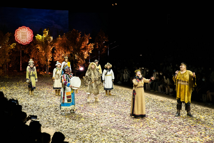 当天下午2点30分,来自远古山林的原生态乐章在北京潮流地标751D·PARK响起,人们被带入一个深邃悠远的沉浸式世界。三位身着鄂伦春族狍皮服饰的非遗文化传承人,以古老传唱揭开“山河·森语”中国鄂伦春文化服饰秀的帷幕,秀场布满金秋的白桦林,一如此刻的北国秋景,浸润着鄂伦春族千百年生息之地的庄严美感。