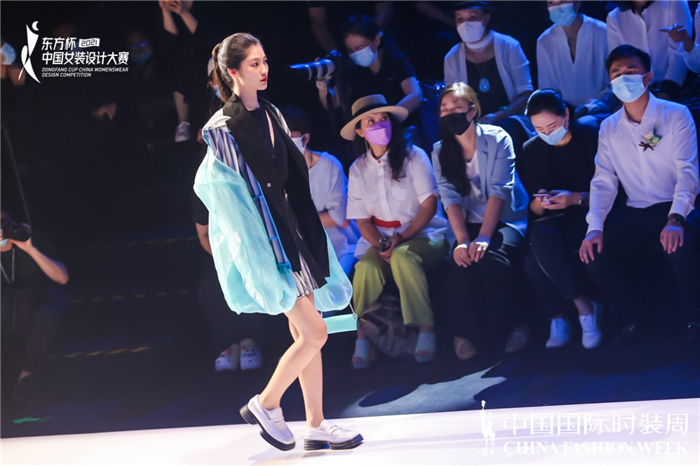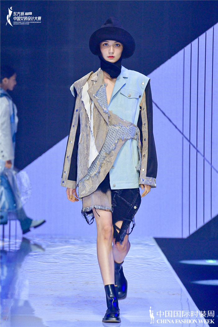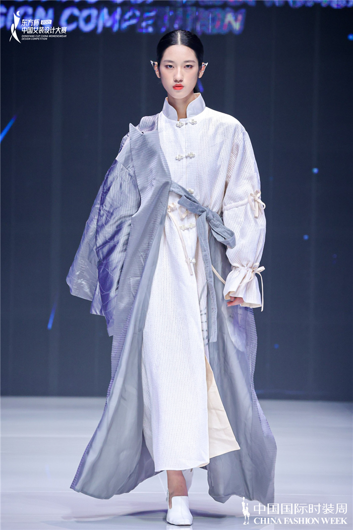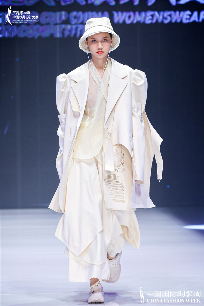金奖选手唐雯婷以“冬日暖阳”为题展开创作,试图安抚人们被疫情笼罩的沮丧情绪。她表示,细腻精妙的剪裁与解构随性的轮廓线条是自己的设计重点,看似硬挺的宽肩夹克实则由轻质运动面料制成,呼应设计主旨。此外,淡灰色、奶白色以及天际蓝等柔和色彩从视觉上输出一种给予受众希望的感觉,充满暖心温情的治愈气息 。