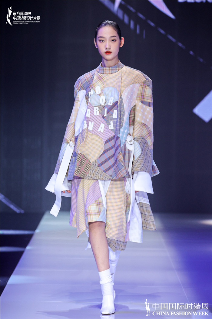 另外,值得一提的是,本次发布秀沿袭大赛传统,面料均来自绸都盛泽。这些面料涵盖色织、提花、蕾丝、欧根纱、仿丝绸、弹力格、功能性面料等种类,经新锐设计师之手变身华彩服装,酷炫的撞色拼接、华丽的装饰手法,不同的视觉元素在舞台上交互碰撞,谱写出女装设计的绝美诗篇。甚至,很多设计师还根据自身设计需要,对成品面料进行二次工艺处理,使之具有无可比拟的创新性,产生新的艺术效果。