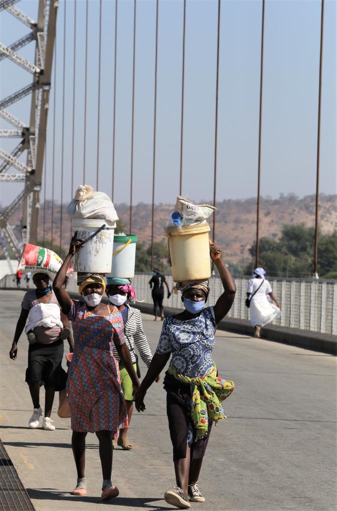 2021年7月5日,妇女们身着花布做成的传统长裙走过津巴布韦马尼卡兰省的一座铁桥。新华社发(陈雅琴摄)