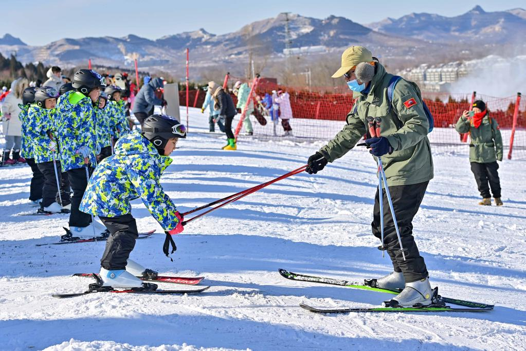 12月25日,在石家庄市鹿泉区一家滑雪运动场,一名孩子在滑雪指导员的带领下练习基本动作。