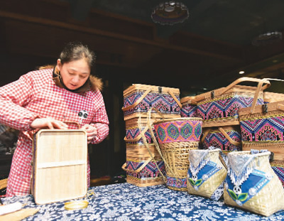 非遗传承人喻婷秀在重庆市酉阳土家族苗族自治县酉州古城非遗“苗绣坊”赶制苗绣文创竹编产品。