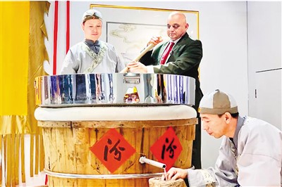 外宾体验汾酒古法酿造工艺。