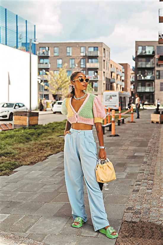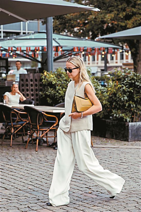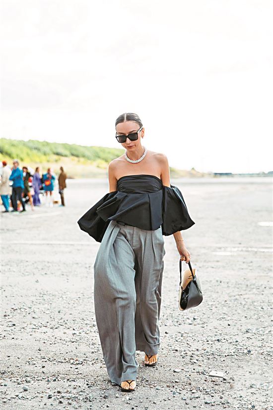▲尝试用相对正式且硬挺的单品中和云朵裤的休闲和柔软感,如西装、抹胸元素混搭。