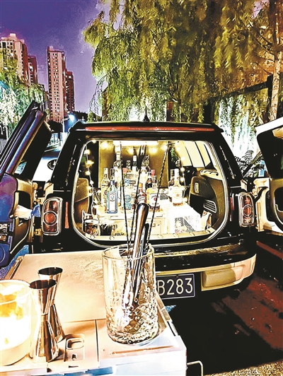 傍晚八点,夜幕刚刚落下,悬挂在敞开的后备箱上的LED彩灯和立式荧光板纷纷亮起,照亮了小片夜空。五米宽的小道上人们摩肩接踵,空气中弥漫着咖啡香和香水味。