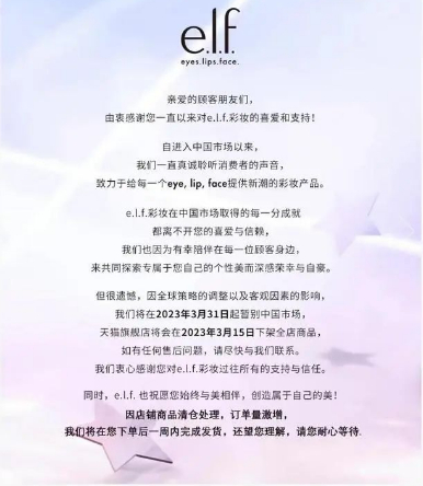 今年2月20日,美国最具代表性的开架彩妆品牌之一e.l.f.在多个平台发布公告称,3月31日起暂别中国市场。而美国知名彩妆品牌Revlon露华浓也曾发布公告称,于2023年3月15日自主终止经营。今年1月,Instagram美妆博主Huda Kattan创立的Huda Beauty宣布退出中国市场,其天猫海外旗舰店目前也已关闭……