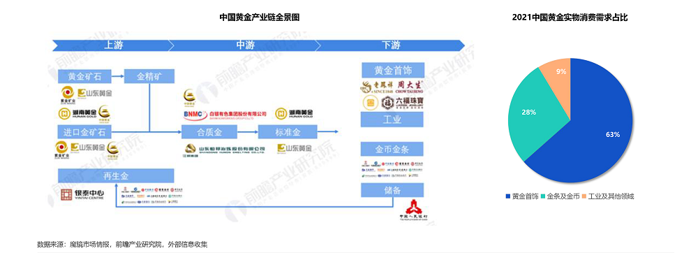 黄金具有商品和金融的双重属性,可分为实物消费市场和金融投资市场。根据前瞻产业研究院,2021年,我国所有黄金实物消费达1121吨,黄金首饰占比超半,达711吨(占比63%),金条和金币消费达313吨(占比28%)。