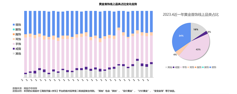 2022年黄金需求接近历史高位,黄金首饰与投资金(金条,金币,小金豆等)线上购买热度大涨。2022.4滚动年黄金首饰类销售额达279亿元,同比增长51%;投资金销售额89亿元,同比增长34%。黄金首饰(占比41%)和投资金(占比13%)占珠宝线上销售总额约54%。从黄金首饰类别来看,手饰和颈饰类别销售占据最大比重,在近一年内分别占据黄金首饰销售的43%和34%,合计占比近80%。而耳饰和黄金戒指类占比较低。
