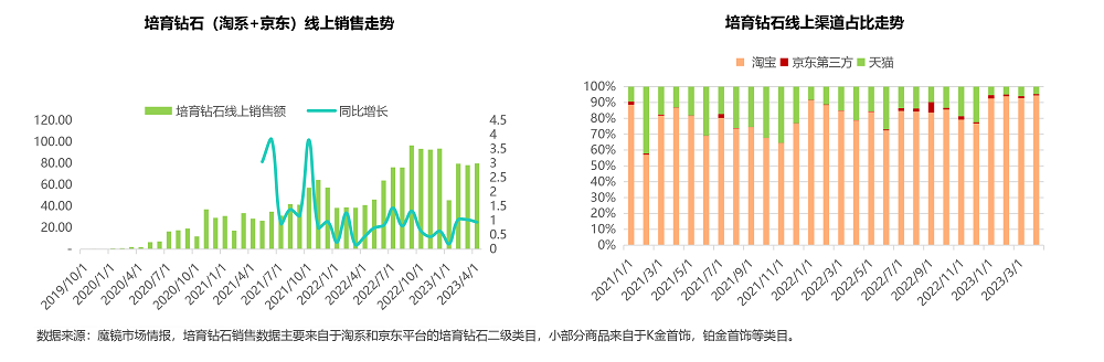 根据魔镜市场情报数据,培育钻石在2023.4滚动年线上电商平台销售额达9.2亿元,年增长率高达80%;在各社媒平台的话题度也有所增加。培育钻石约在2020年初开启线上销售,2023.4滚动年在淘系+京东平台的销售额达到9.2亿元,同比增长80.4%。自从上线以来,培育钻石每月都能保持正向的同比增长。2023年4月单月同比增长在94%左右。