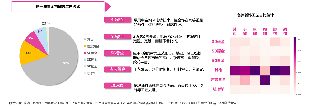 在消费者对黄金饰品外观愈发挑剔的今天,不断迭代的加工工艺赋予了首饰更高的强度和更加新奇的外观表现,满足了各类人群的消费需求。其中包含3D、5D硬金,5G工艺,古法黄金,珐琅彩等等。但各金饰品类中仍以普货黄金销售占比最高。而国货国潮和IP联名等相关首饰的兴起,以及金饰在场景和人群方面的扩张将不断推动新兴黄金制作工艺的发展。