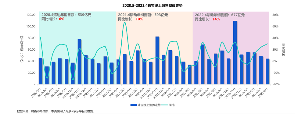 我国是珠宝消费品大国,根据中国珠宝玉石首饰行业协会推算,2022年中国珠宝玉石首饰产业市场规模约为7,190亿元,其中黄金首饰达4100亿元;玉石类和钻石类也分别达到1470亿元和820亿元。国家统计局数据显示,2023年1-4月金银珠宝零售额1181亿元,同比增长18.5%,在年初表现出较强的复苏迹象。新华网与魔镜市场情报连联合推出“珠宝行业电商平台观察报告”,旨在关注行业发展,探寻产业走势。