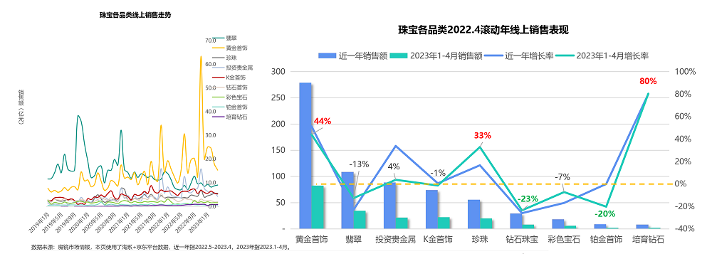 近3年中,珠宝大盘线上消费逐步攀升。2022.4滚动年线上电商平台珠宝类消费达约677亿元,同比增长14%,增长率也处于逐年提高中。黄金首饰和投资贵金属线上消费额各达到279亿元和89亿元,同比增长各为51%和34%。可作为钻石替代品的实验室培育钻石则延续了2年以来的增长趋势,年销售额9亿元,年增长率达80%。