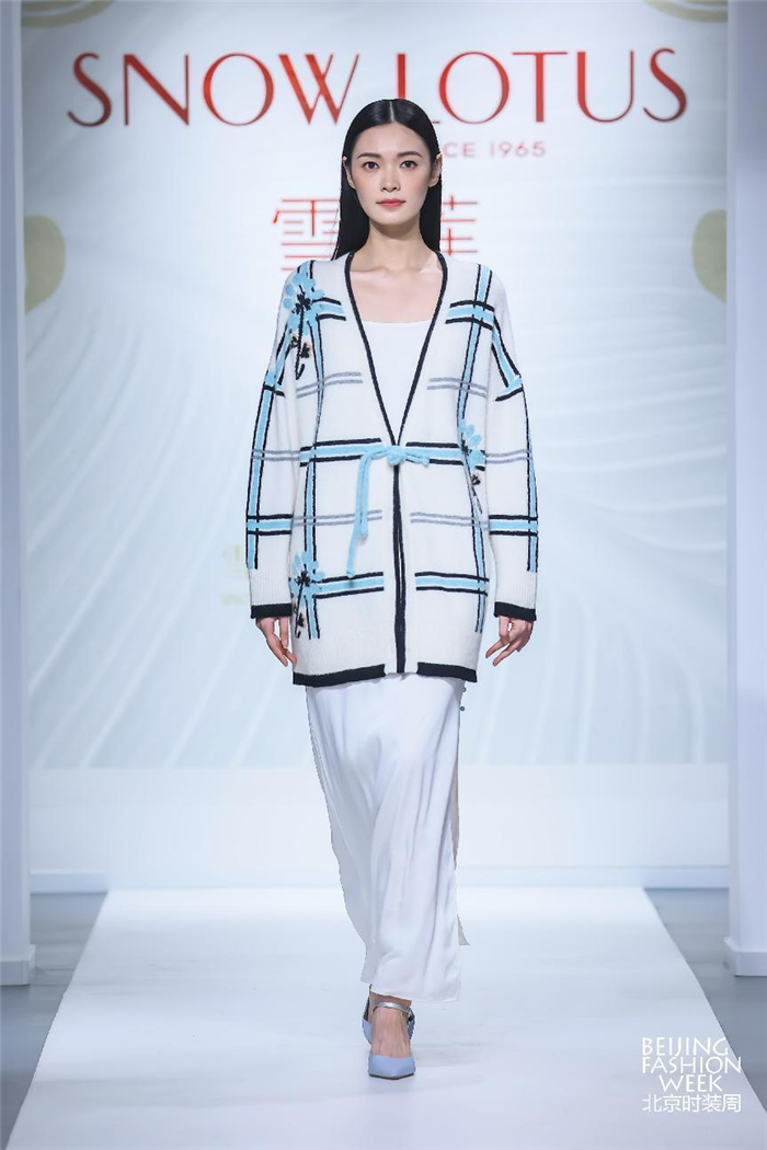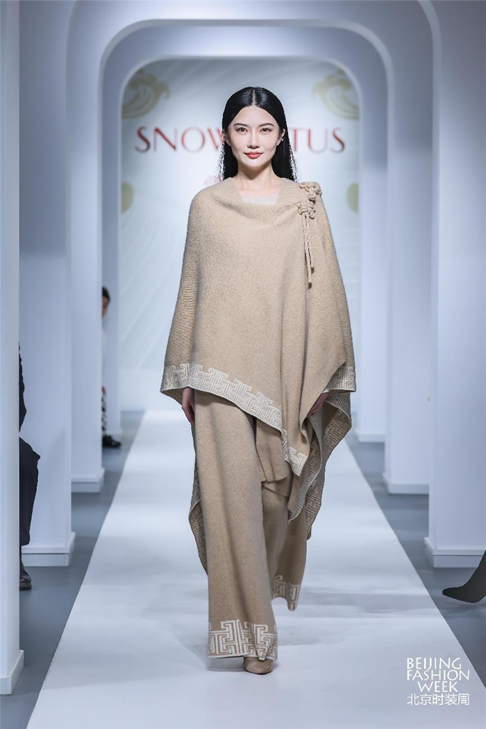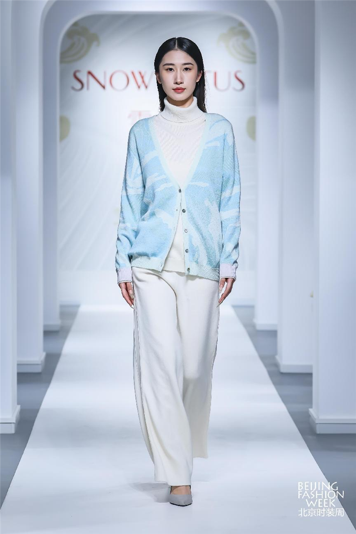 “原色之美”系列,主要采用未经任何染色工艺的原色羊绒纱线进行设计创作。原色羊绒极大程度减少了羊绒纤维在染色环节的损伤,呈现羊绒本真的天然色泽,使服装所具有的质地更为柔软亲肤、温和顺滑,带着纯天然、无染色、稀缺性的标签,致敬大自然最本真的馈赠。不仅如此,该系列多款设计所运用的“回型纹”格外亮眼,图案象征着百转千回、连绵不绝、生生不息,同时使羊绒颇具青铜器般的力量感和东方艺术的气势。该纹样是近年来雪莲羊绒设计的经典之作。