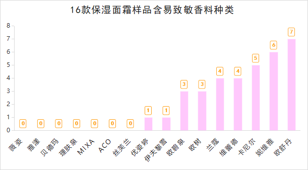 这次比较试验通过对保湿面霜配料表分析,发现有7款样品不含有易致敏的香料成分,标称品牌为分别为薇姿、雅漾、贝德玛、理肤泉、MIXA、ACO、丝芙兰的样品。其余9款样品均含有易致敏的香料成分,标称品牌为分别是欧舒丹含有7种、妮维雅含有6种、卡尼尔含有5种、兰蔻含有4种、维蕾德含有4种、欧树含有3种、碧欧泉含有3种、优姿婷含有1种、伊夫黎雪含有1种。标称品牌为MIXA的样品含有易干扰内分泌的化学成分。