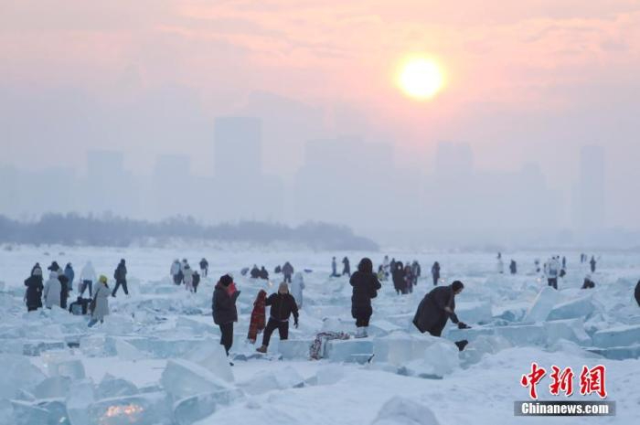 黑龙江哈尔滨松花江畔一处停用的采冰场吸引游客拍照“打卡”。 中新社发 于琨 摄