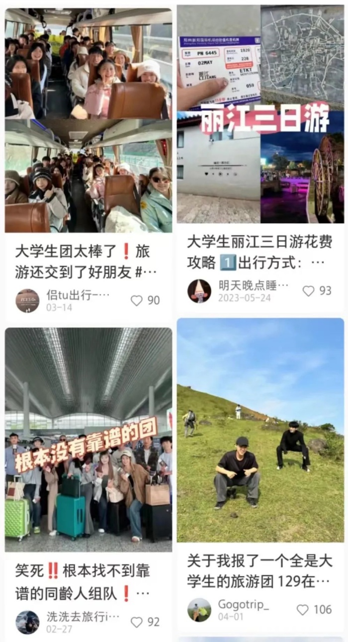 某社交平台上年轻人分享旅游团出行经历。图片来源:网络截图