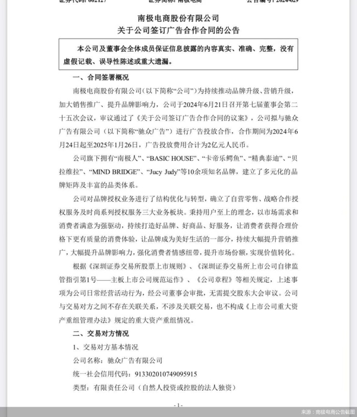 6月24日开盘,南极电商股价走出近几年的新低,截至收盘,报2.51元/股,跌幅达2.71%。消息面上,前一天晚上南极电商发布公告称,为持续推动品牌升级、营销升级,加大销售推广、提升品牌影响力,公司拟与驰众广告有限公司进行广告投放合作,合作期间为2024年6月24日起至2025年1月26日,广告投放费用合计为2亿元。