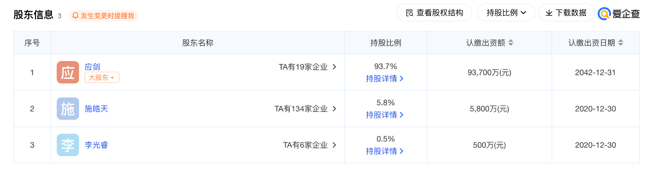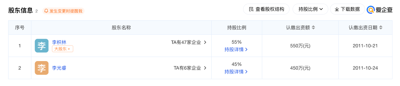 另一家公司“广州哥弟真的好贸易有限公司”则成立于2011年,其中实控人、法定代表人应剑拥有93.7%的股份,“哥弟”品牌创始人之子施皓天拥有5.8%的股份,李光睿拥有0.5%的股份。