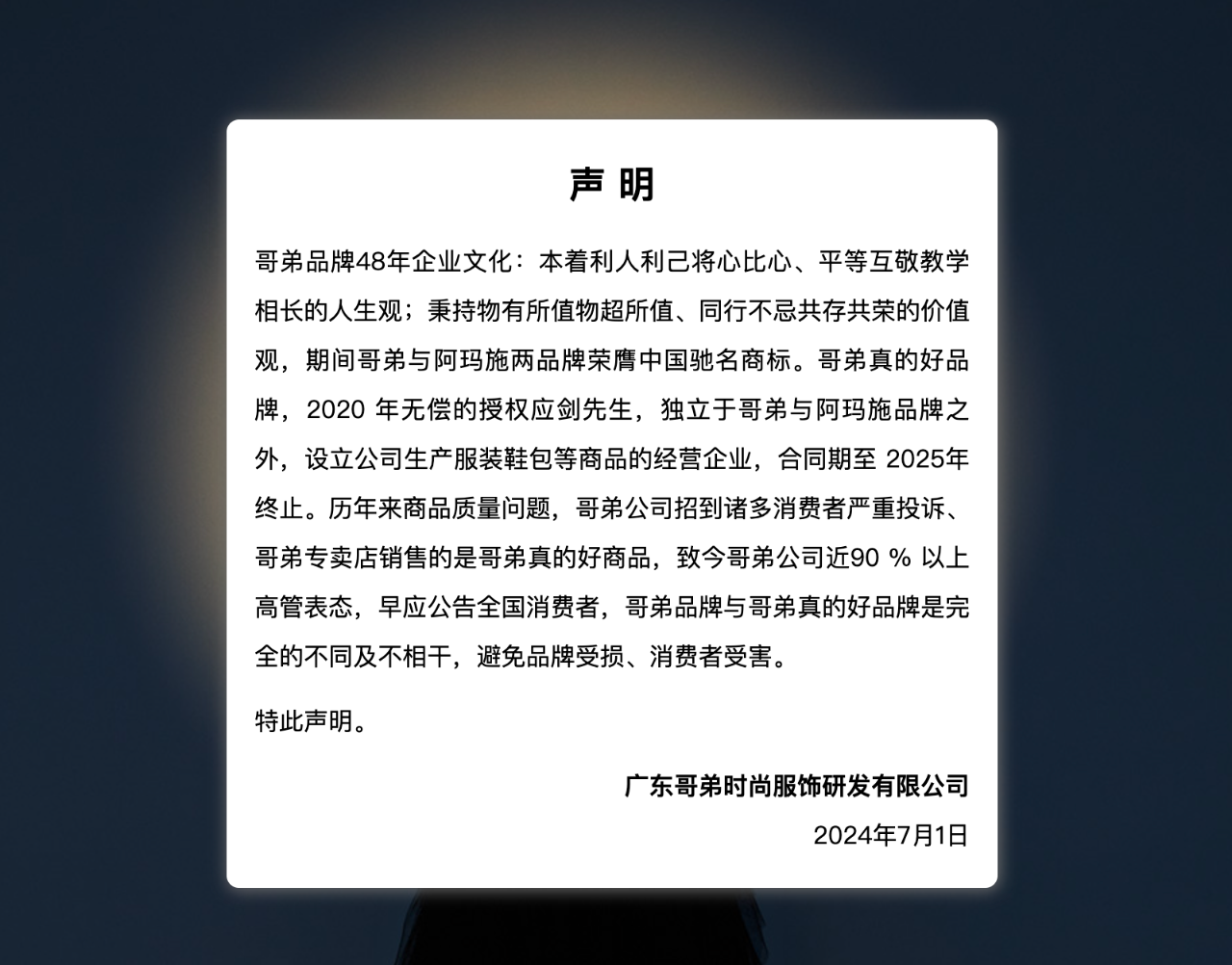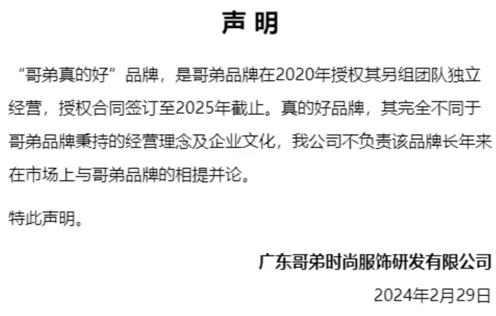 7月1日,广东哥弟时尚服饰研发有限公司(以下简称“哥弟”公司)在“哥弟”官网发表了一则澄清声明。