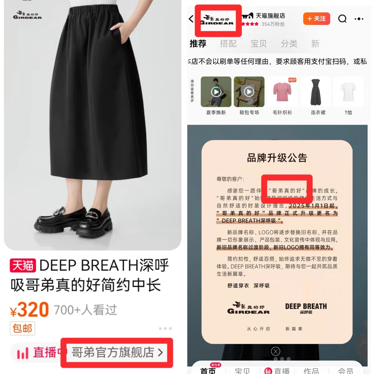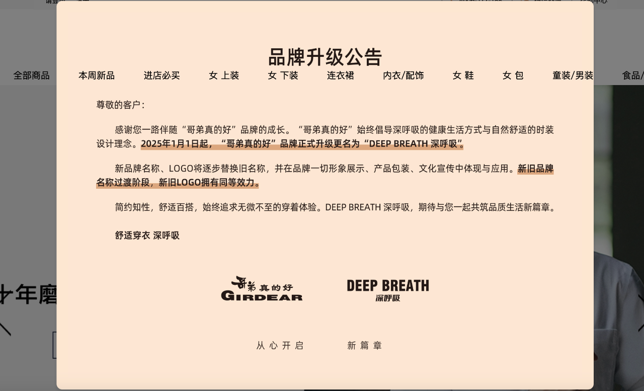 同样在近日,“哥弟真的好”也在其品牌官网及天猫、京东旗舰店发布公告,表示自2025年1月1日起,“哥弟真的好”品牌将正式升级更名为“DEEP BREATH深呼吸”,新品牌名称、logo将逐步替换旧名称,并在品牌一切形象展示、产品包装、文化宣传中体现与应用。在新旧品牌过渡阶段,新旧logo拥有同等效力。