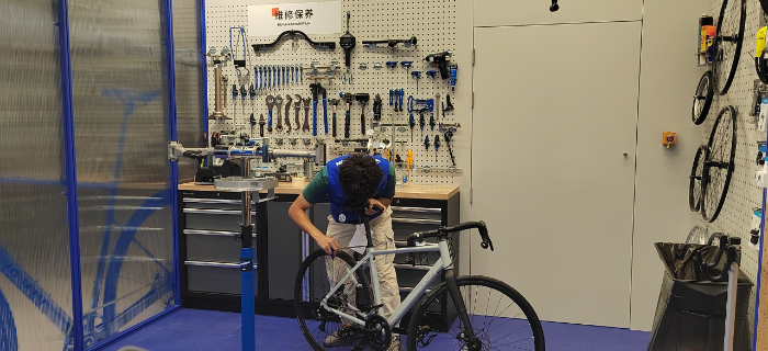 门店工作人员正在为购买自行车的顾客进行现场调试。