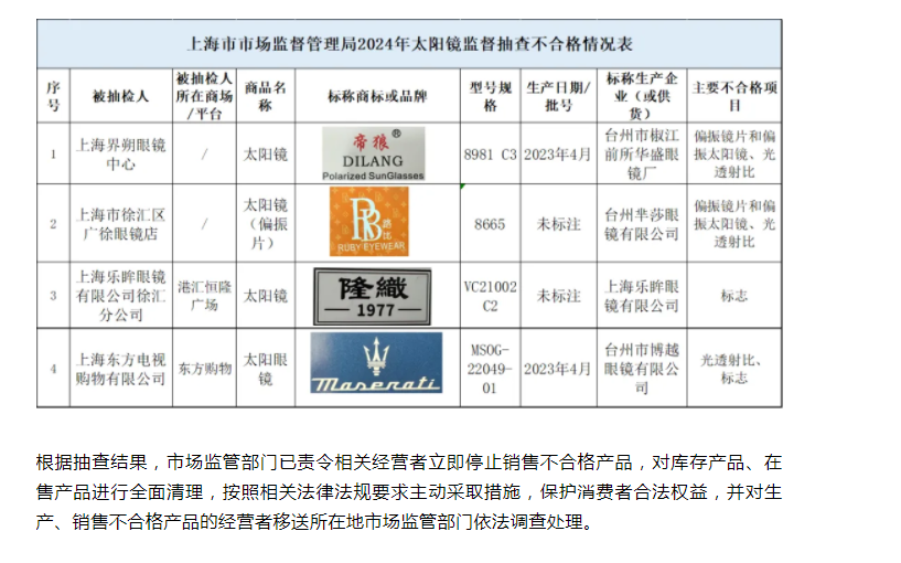 针对消费者投诉、举报集中及质量问题较多的产品,近期,上海市市场监督管理局集中组织力量对东方购物、i百联、天猫、京 东4家网络平台以及浦东、徐汇、黄浦、静安、虹口5个区域销售的30个品牌30批次太阳镜进行了监督抽查。经检测,有4批次不合格,不合格检出率为13.3%。