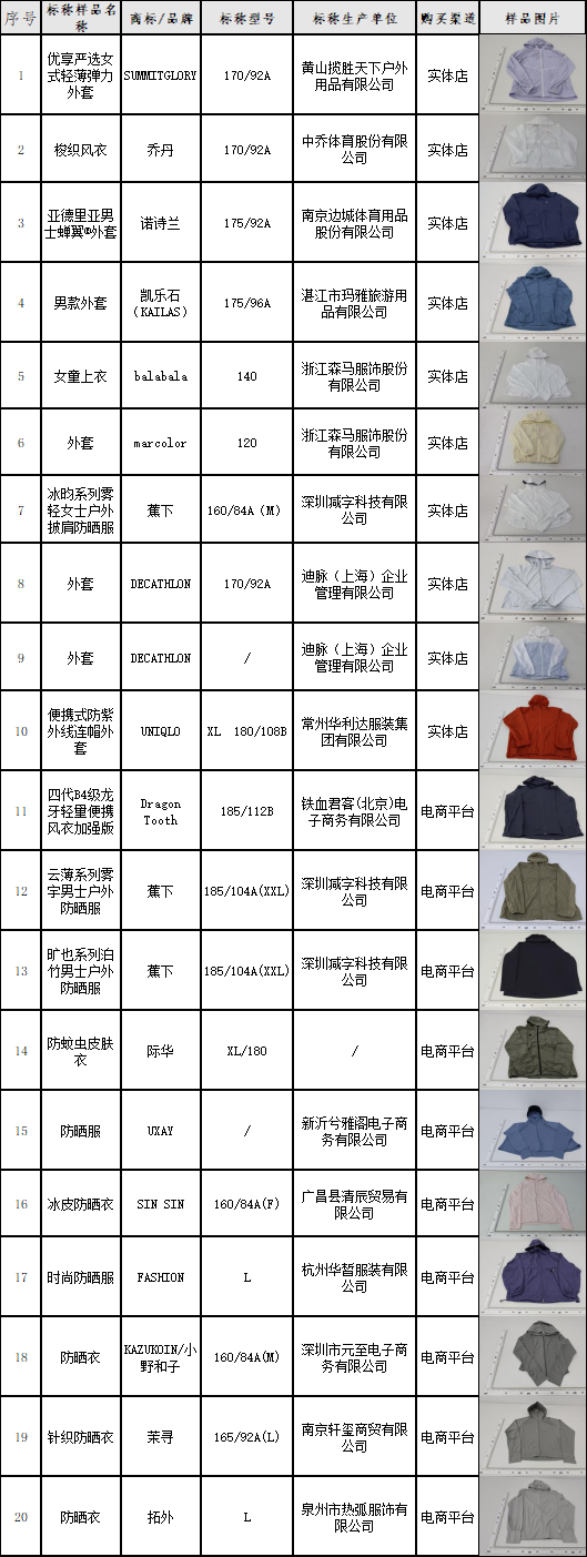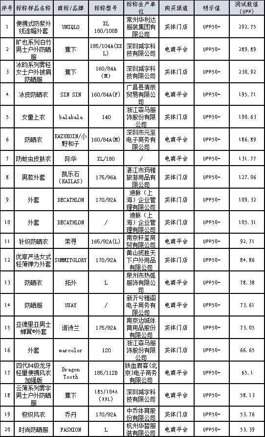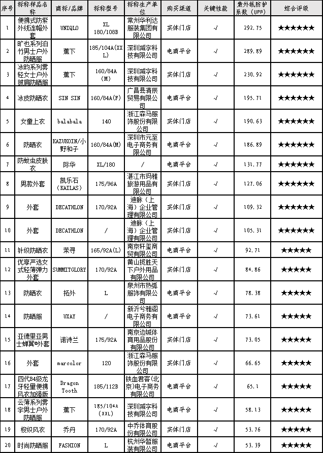 本次比较实验测评的20款防晒衣产品,经检验未发现不合格情况。