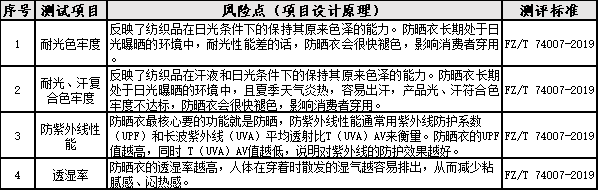 本次比较试验根据消费者的关注点、产品的关键性能等确定测评项目。测评项目包括耐光色牢度、耐光、汗复合色牢度、防紫外线性能、透湿率,包含我国推荐性行业标准FZ/T 74007-2019《户外防晒皮肤衣》,测评项目见表2。