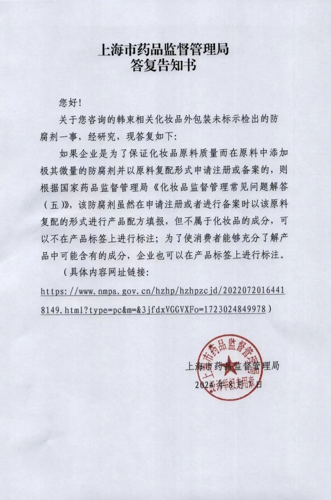 2024年8月7日,上海市药品监督管理局就韩束相关化妆品外包装未标示检出防腐剂一事的答复告知书也再次重申了上述技术指南和监管问答精神。