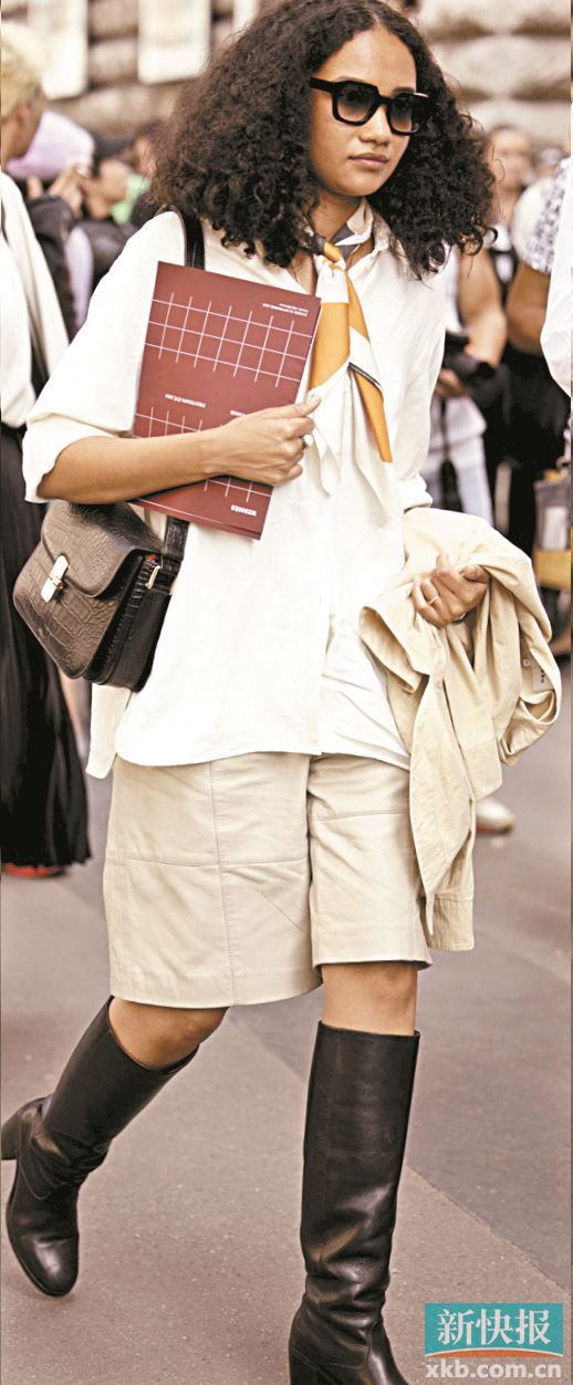 “长+短”的搭配还能进阶为“长+短+长”,短裤与靴子可平衡腿部比例线条,尤其直筒长靴更显干净利落。