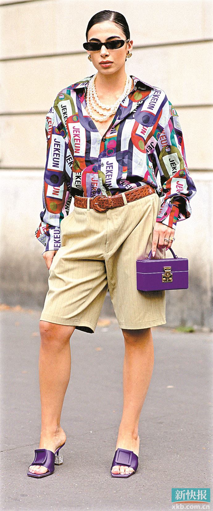 大廓形衬衫搭短裤营造“上宽下窄”的视觉效果,修饰脸型的同时让造型感更强。