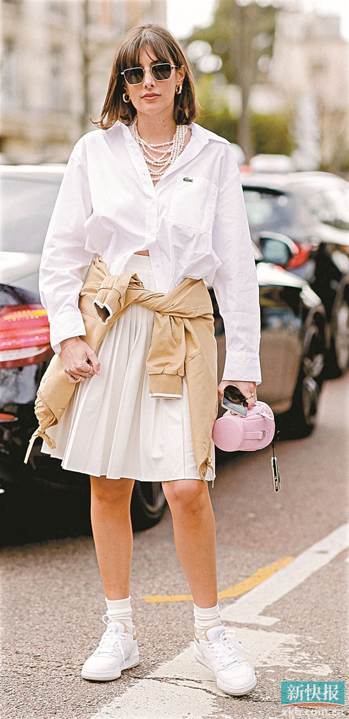 短裙搭配也是不错的尝试,衬衫下摆解开几颗扣子,让高腰下装露出腰头是显高小技巧之一。